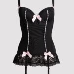 If you've always wanted to play the seductive siren, but never had quite the wardrobe, then this is the basque for you. Super-soft black microfiber trimmed with ruffled floral lace and pink ribbons gently sculpts your curves for a slinky shape.Offering support as well as a sultry silhouette, the underwired padded cups and wide shoulder straps lift your ladies for an enviable cleavage, with the pink satin bows and Lovehoney heart charm drawing the eye upwards. The basque fastens at the rear with an adjustable row of hooks-and-eyes, which, together with the stretchy microfiber, keeps you comfortable all throughout wear. 6 plastic bones gently contour your body to create an hourglass shape, with pink ribbon slot detail to the front accentuating the curves of your torso. The hemline is trimmed with scalloped floral lace, beneath which, 4 adjustable garter straps can be added or removed, depending on whether you want to wear stockings with your basque or not. Finally, the matching bow-trimmed G-string frames your booty to complete your curvaceous ensemble. Model is a US size 14 and 5'6' tall with a 36F bust. She is wearing size 1X/2X.WARNING: This product can expose you to harmful chemicals. For more information, please click here